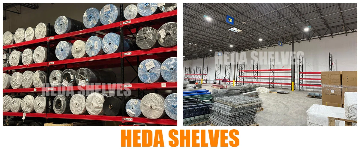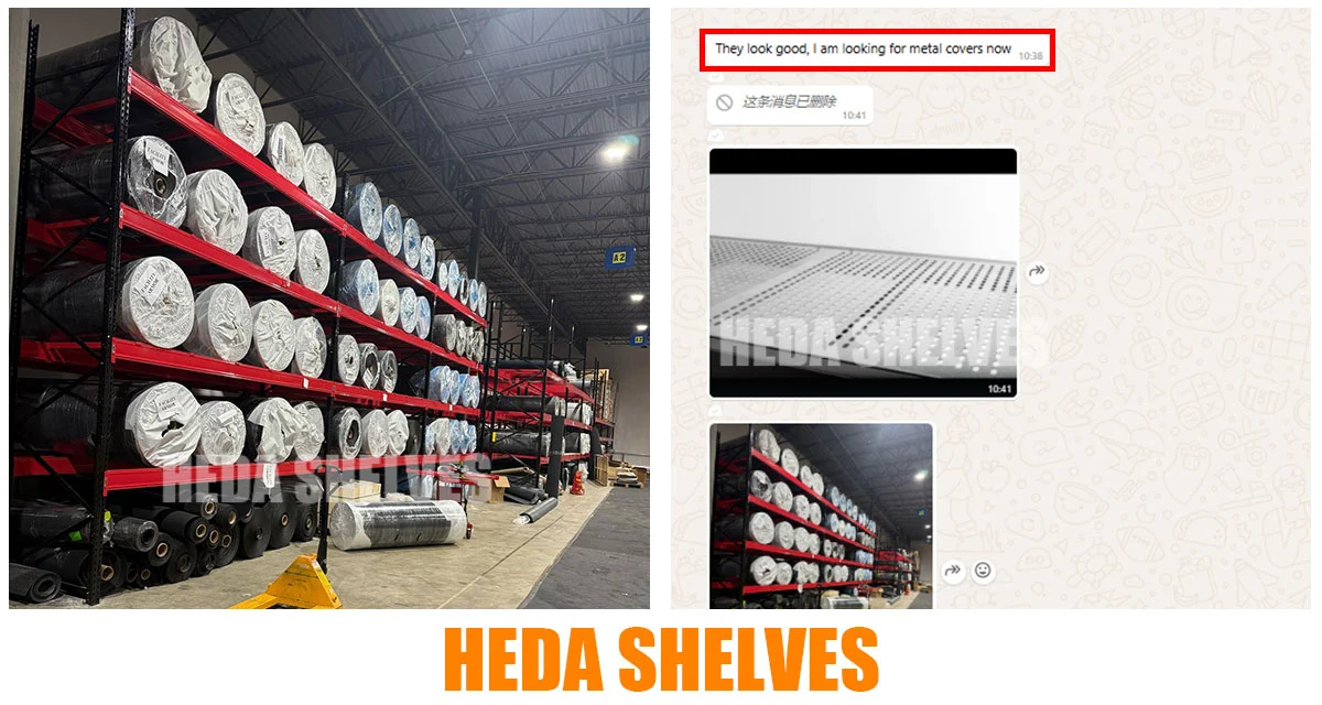 To express their satisfaction, the customer also sent us real photos from their warehouse – proudly showing the racks loaded with neatly stacked fabric rolls, a strong endorsement of the quality and reliability of Heda Shelves.