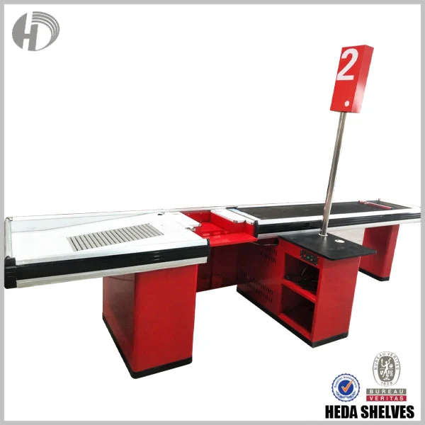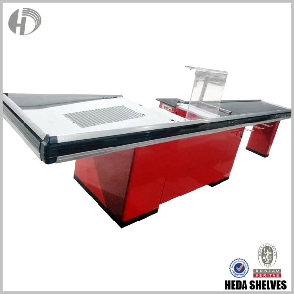 Supermarket store checkout counter 3500*1150*850 With brushed stainless steel countertop, CE certified motor, infrared probe sensor, with emergency stop button, optional 110V/220V voltage, color and size can be customized.